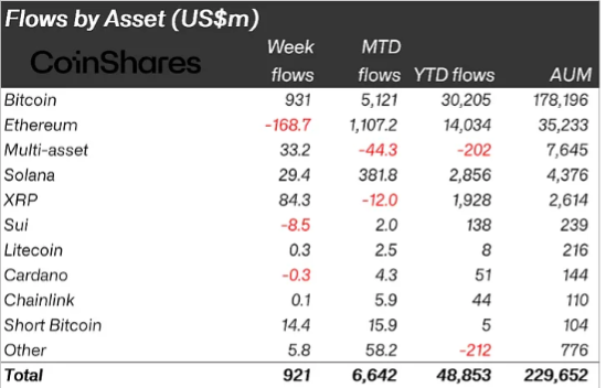 Bitcoin led the surge with $931 million in inflows. Its total inflows since the Federal Reserve began cutting rates have now reached $9.4 billion. Year-to-date inflows stand at $30.2 billion, still below last year’s $41.6 billion.