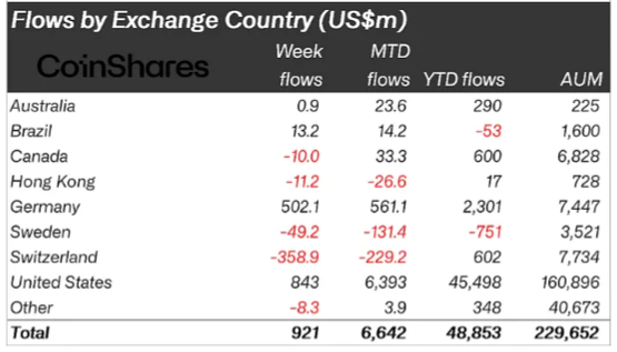 According to the CoinShares report released on October 27, most of the buying came from the United States and Germany, while Switzerland saw outflows caused by asset transfers, not selling.