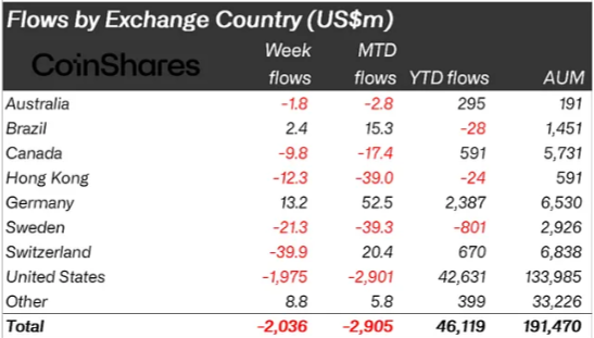 That decline reflected widespread caution as investors stepped back from single coin products. Specifically, the United States recorded $1.97 billion in outflows while Switzerland and Sweden also saw losses. On the other hand, Germany took a different path with $13.2 million in inflows as some buyers saw lower prices as a chance to enter the market.