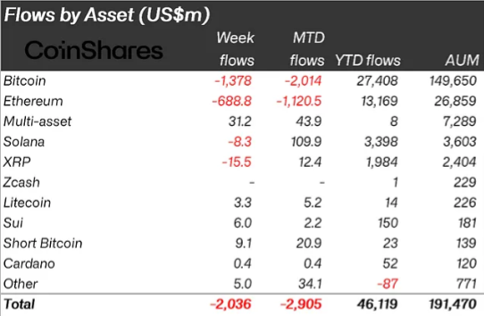 Digital asset ETPs saw $2 billion leave the market last week as investors reacted to unclear policy signals and large crypto holders selling their coins.
