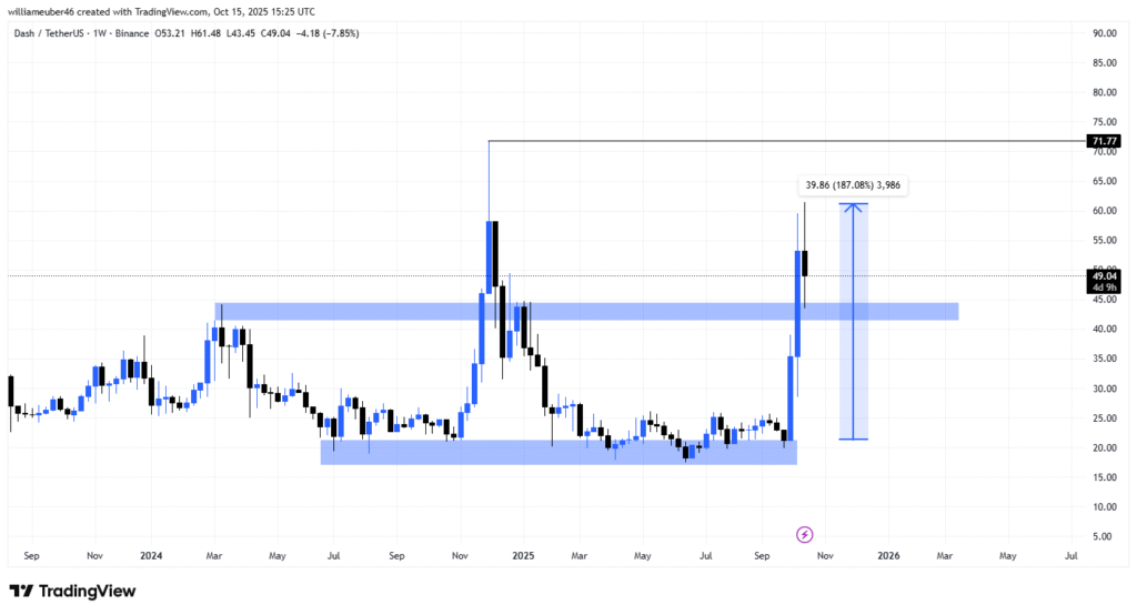 Turning to the long-term technical view, the DASH chart shows a powerful breakout. The price spent many months stuck in a low accumulation area between $18 and $22. This recent move upward, which started on the 25th of September, clearly exited this long-term trading range, giving the market a 187% surge in price before cooling down.