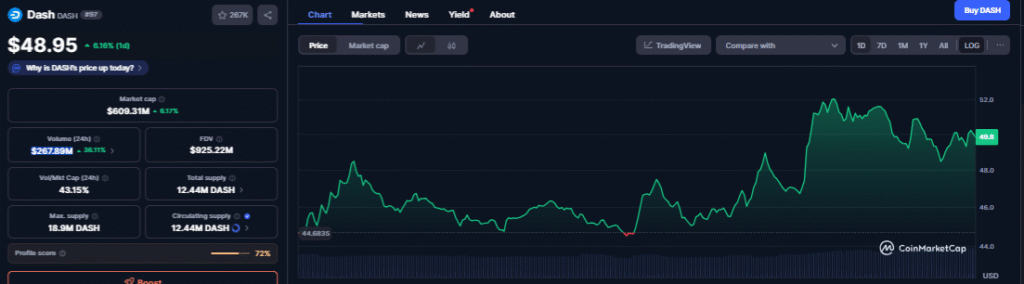 Dash (DASH) recently saw a significant price jump and is now trading $48.93, a strong 5.86% gain in the last 24 hours. This is due to the 35% increase in trading activity within the same period of time. This puts its trading volume at about $267.89 million.