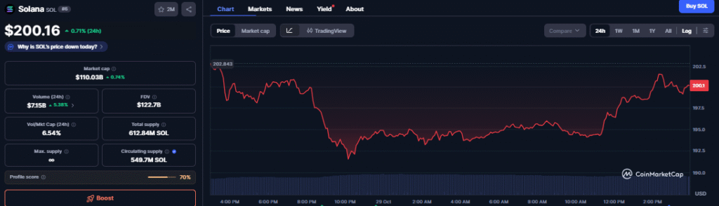 Given the excitement, Solana’s price rose about 1% to $200 before the U.S. Federal Reserve’s October decision. Its trading volume rose by 5.47% in the last 24 hours, showing continued interest from traders.
