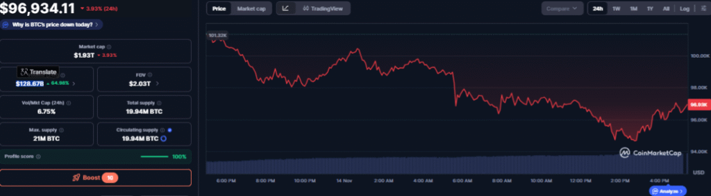 At the time of writing, Bitcoin is trading for $96,768, down over4% in the last 24 hours with a trading volume of $128.44B within the same period of time.