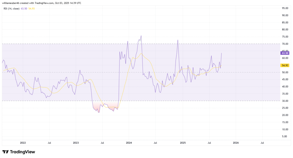 Notably, when adding indicators like the RSI, which is known for monitoring momentum in the market, it is observed that the price is trading at the 63.73 level, above its EMA line of 54.96. This means that the market is in an uptrend.