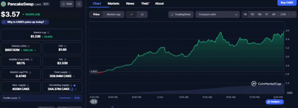 Pancakeswap token, CAKE, is trading at $3.5, which is a 35% surge in price in the last 24 hours. This is a result of a 948% increase in trading activity during the same period, bringing its total trading volume to $743 million, with a total market cap of $1.2 billion, according to CoinMarketCap.
