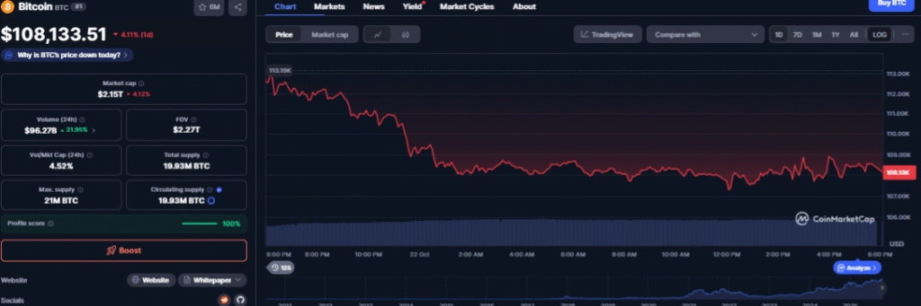 Earlier this month, Bitcoin recently hit a record high of $126,000 on October 6 but later slipped as fears of a trade war grew. At the time of reporting, Bitcoin is trading around $108,200, down roughly 4% in the last 24 hours, according to CoinMarketCap.
