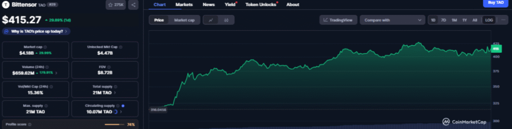 At the time of reporting, the token is trading for $415.27, due to a 174% increase in trading activity, putting it at a trading volume of $662.18 million in the same period of time. Meanwhile, TAO’s market cap climbed to $4.18 billion.