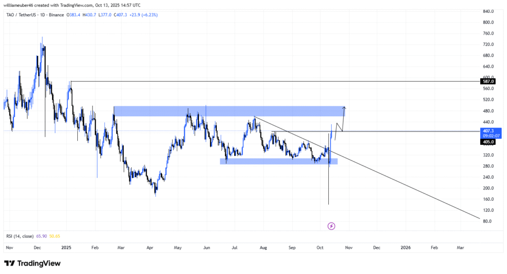 Bittensor (TAO) just surged nearly 29% in 24 hours after a massive crypto market crash that wiped out over $500B in total market value on October 11, causing nearly $20 billion in liquidations of top digital assets.